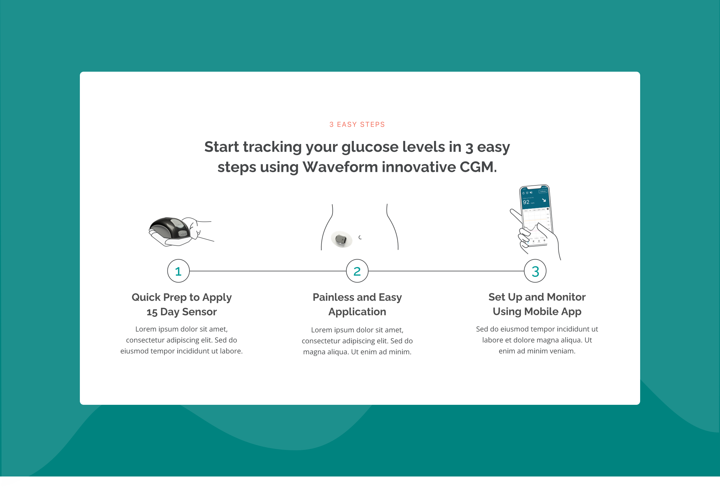 To create a relatable and approachable aesthetic, the design incorporates custom illustrations, product images, and warm lifestyle photography. Clear icons and concise content blocks emphasize the CGM system's key attributes—affordability, ease of use, long-lasting performance, and eco-friendly features. This cohesive design ensures an engaging user experience that reflects WaveForm Technologies' mission to revolutionize diabetes care.